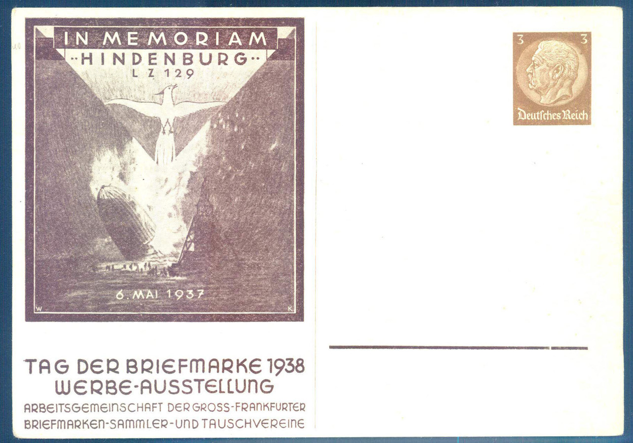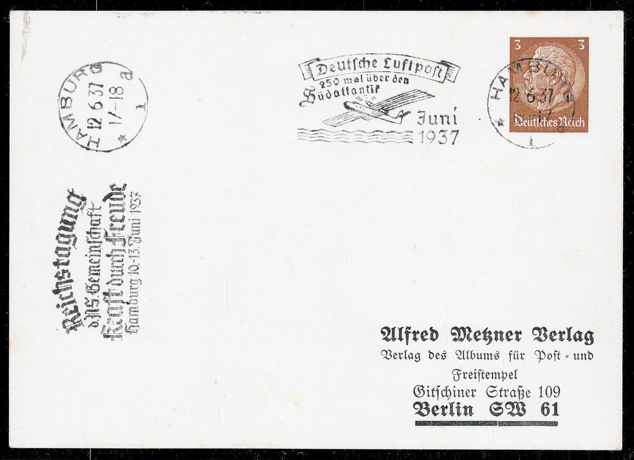 3Pf Hindenburg private postal stationary with promotional postmark regarding the 250th crossing of the South Atlantic in June 1937, details see image.