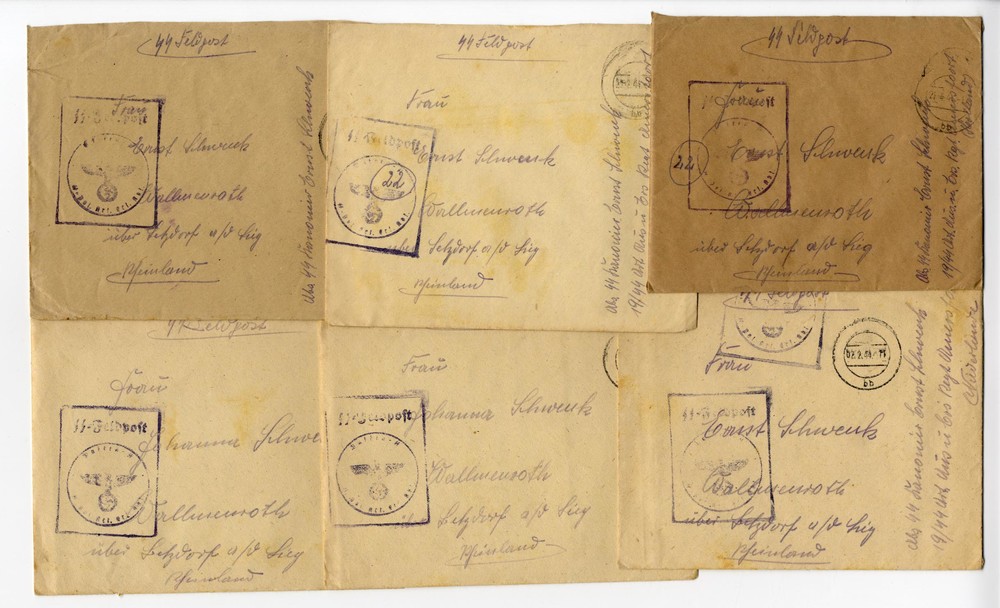 1944, SS field post correspondence of 6 letters with content, addressor: gunner Ernst Schwenk, Art. Ausb. u. Ers. Regt. Amesdorf Holland, details see image.