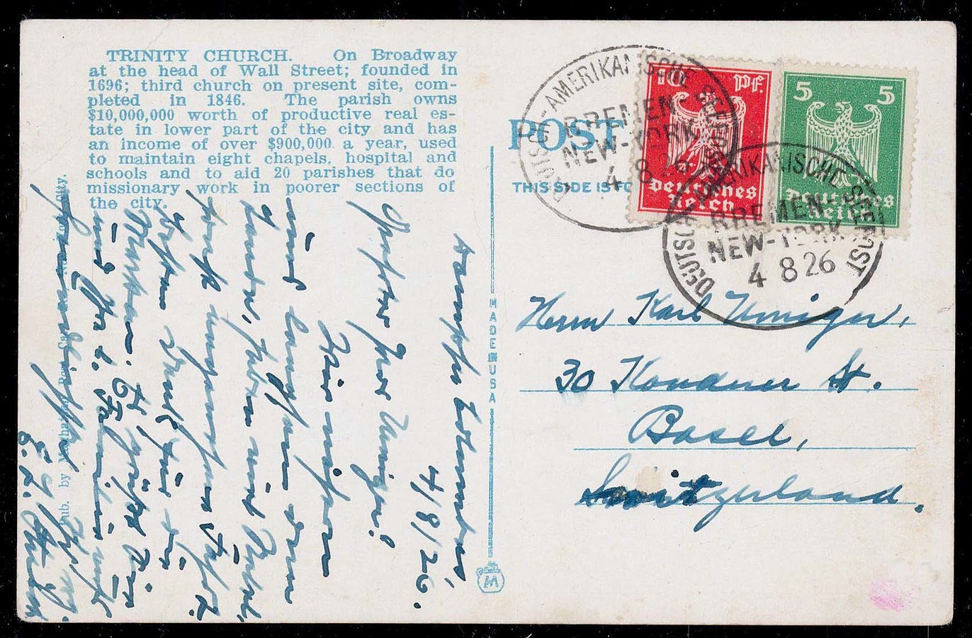 Steamer Columbus, 4.8.1926, postcard with cancellation "Deutsch-Amerikanische-Seepost Bremen - New York" to Basel/Switzerland, details see image.