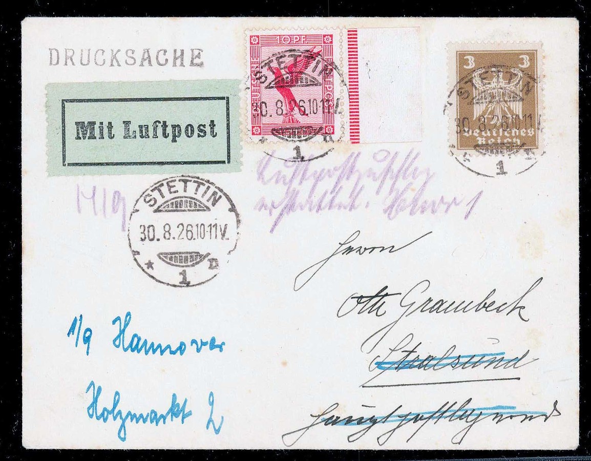 30.8.1926, Szczecin-Stralsund, air mail printed matter, minimally dirty, (Michel ZF 26.65)03), details see image.