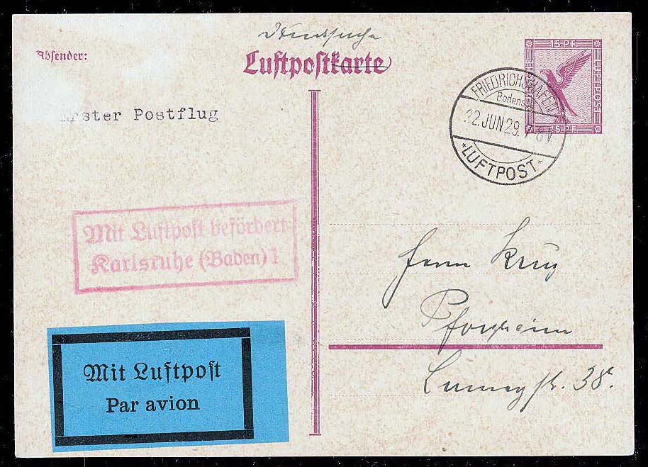 Friedrichshafen 22.6.1929. Ganzsache Erstflug Friedrichshafen-Stuttgart und weiterbefördert nach Karlsruhe.