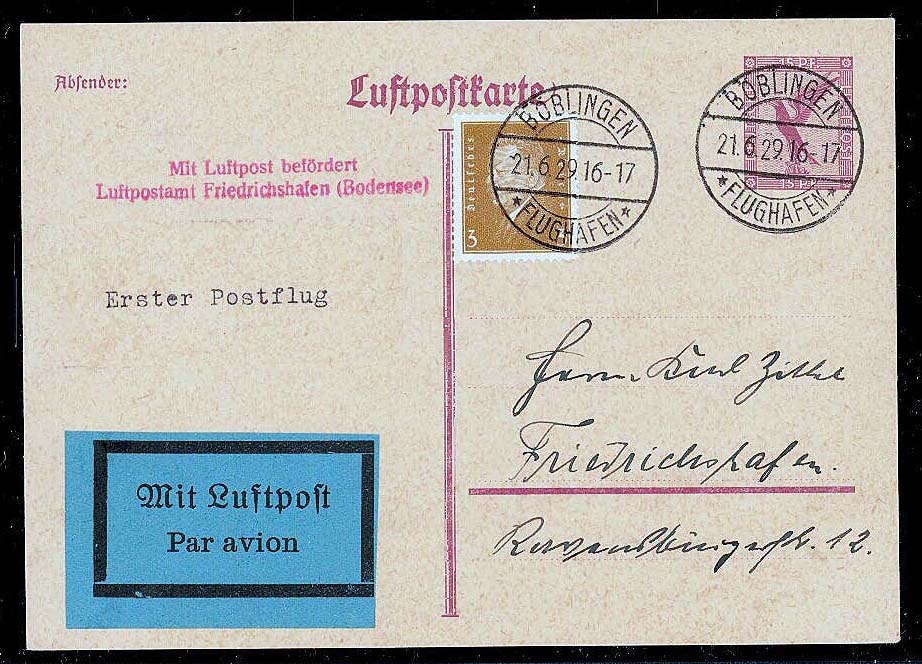 Böblingen 21.6.1929. Ganzsache Erstflug Stuttgart-Friedrichshafen.