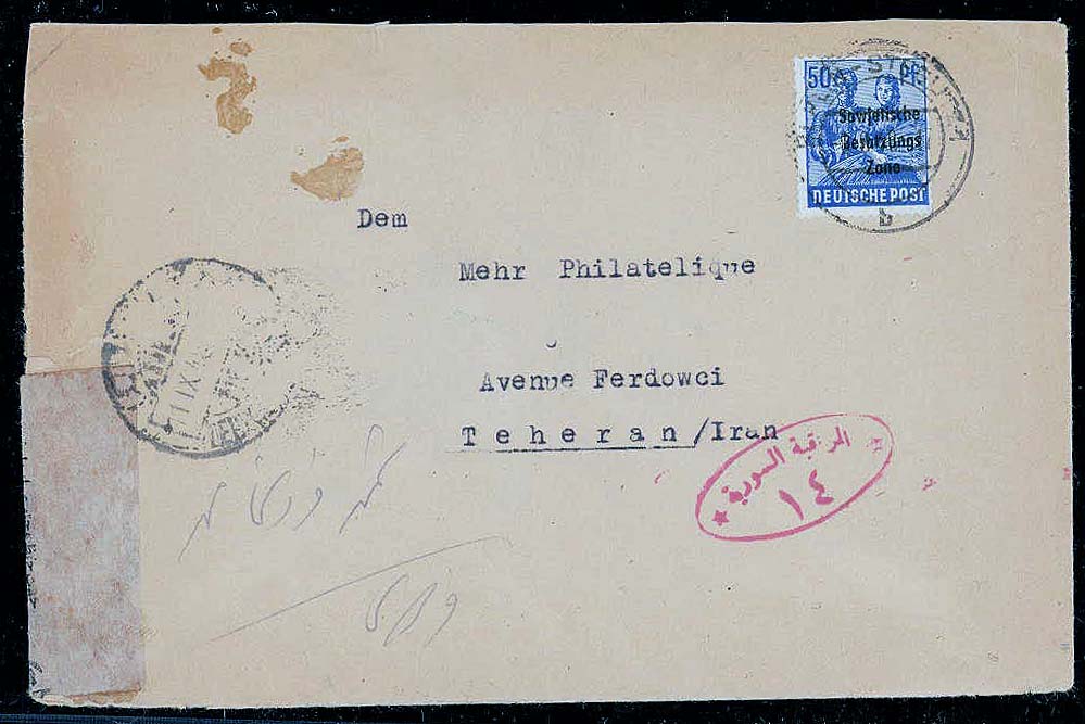 50Pf SBZ Maschinenaufdruck in Berlin Steglitz 1948 aufgegeben auf Bedarfsbrief nach Teheran und entsprechender Zensur. Kleine Bedarfsmängel.