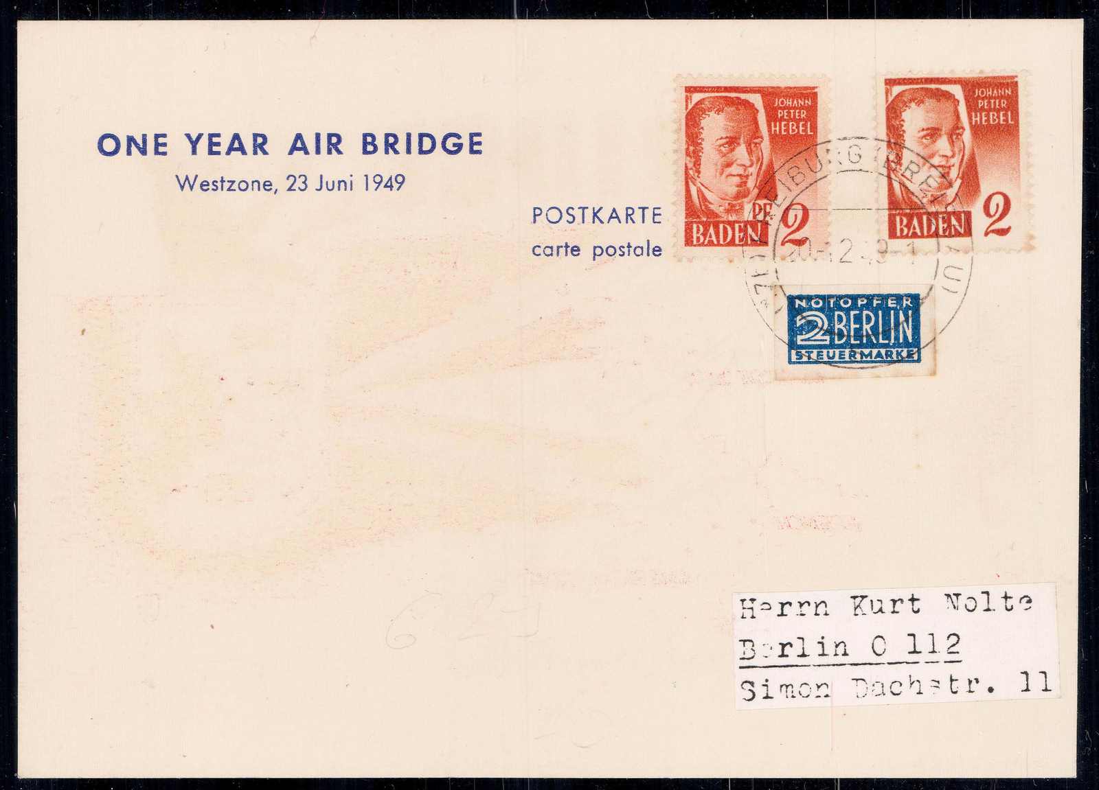 Ein Jahr Luftbrücke Berlin Sonderkarte mit 2x2Pf Baden nach Berlin geschickt.