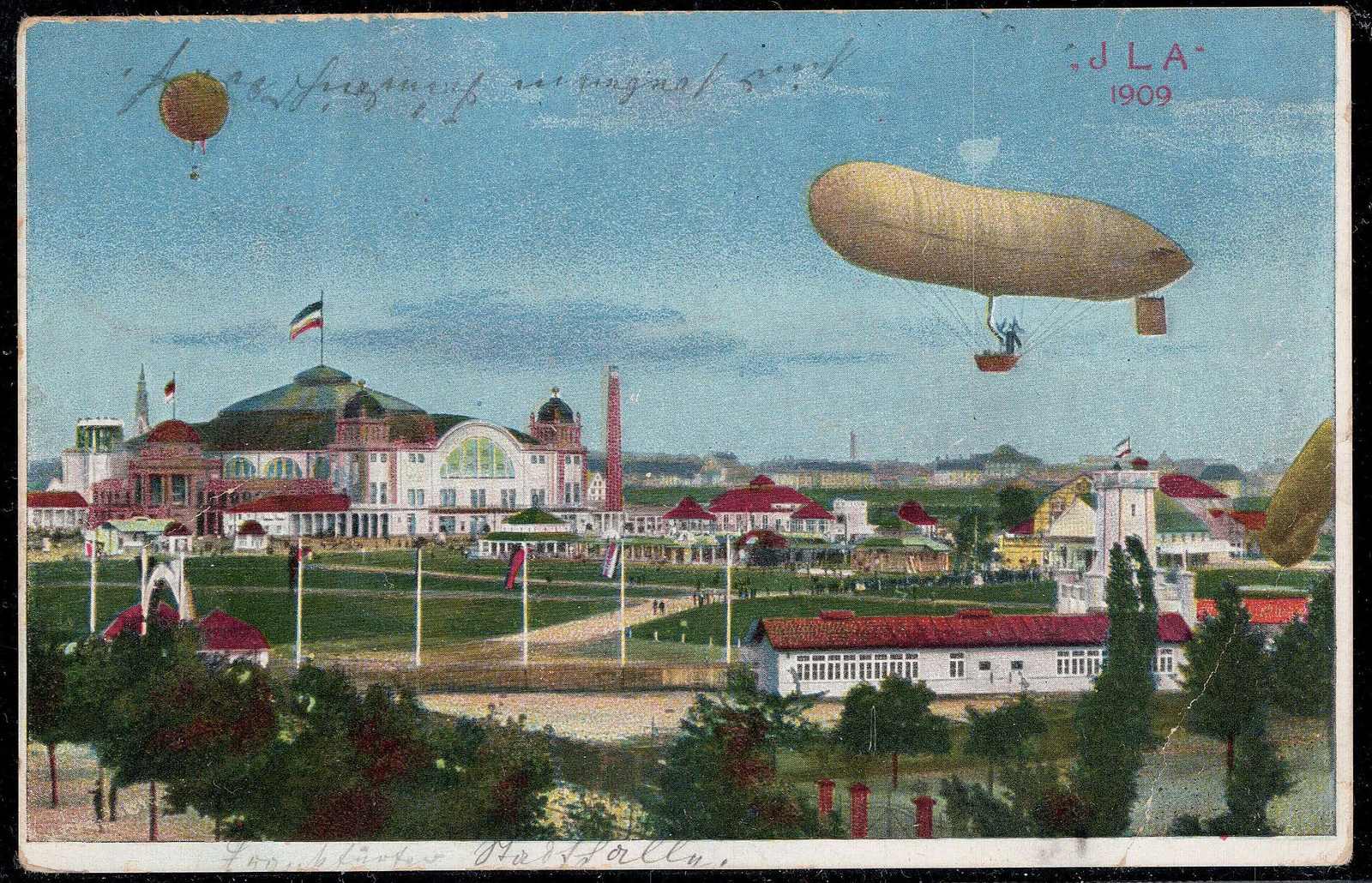 Internationale Luftschiffahrt-Ausstellung Frankfurt a.M. 1909 (ILA). " ILA " 1909, mehrfabiger Druck, Motiv lenkbare Luftschiff "Parseval" über dem Ausstellungsplatz und der Festhalle, Verlag Block & Schmidt, echt gelaufen.