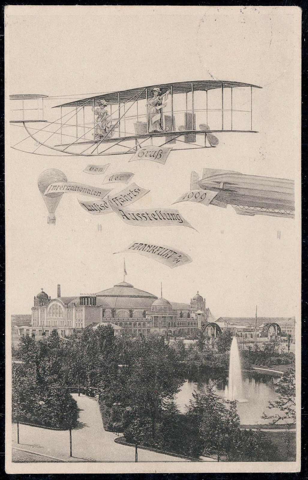 Internationale Luftschiffahrt-Ausstellung Frankfurt a.M. 1909 (ILA). Gruss von der Internationalen luftschiffahrt-Ausstellung Frankfurt a.M.1909, Motive Zeppelin, Flugzeug und Heißluftballon über Frankfurt, Verlag L. Klement, echt gelaufen.