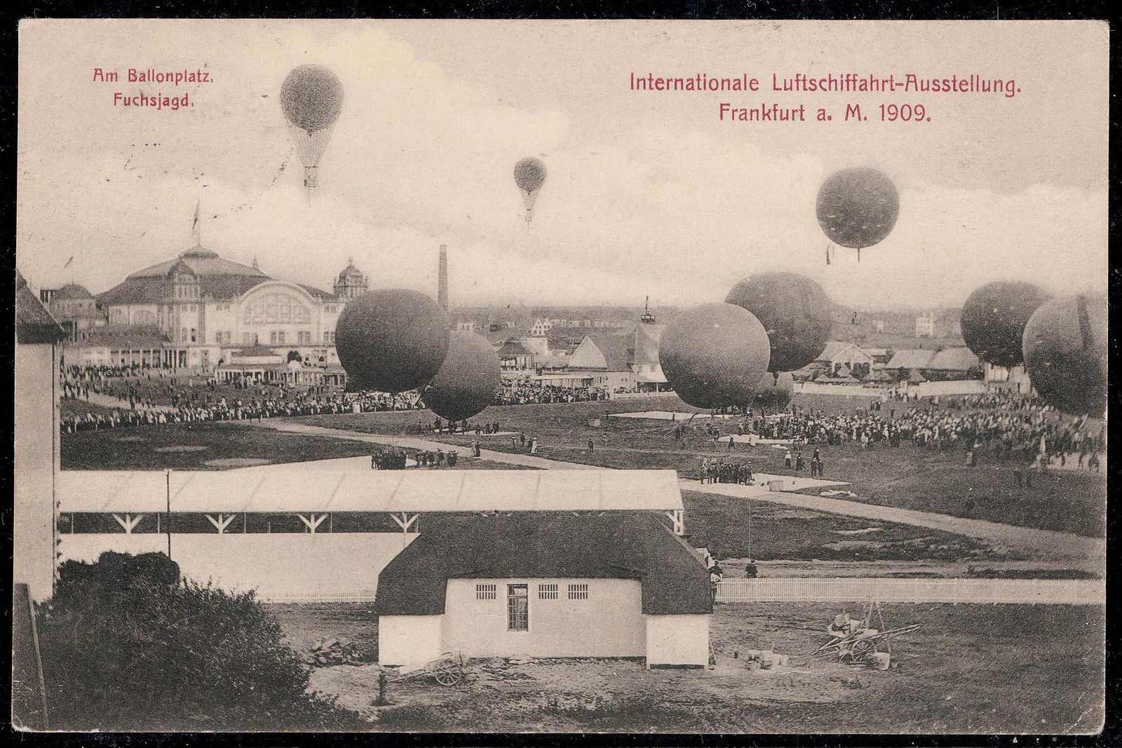 Internationale Luftschiffahrt-Ausstellung Frankfurt a.M. 1909 (ILA). Massen - Ballon - Aufstieg am Ballonplatz, Fuchsjagd, Verlag L. Klement, echt gelaufen.