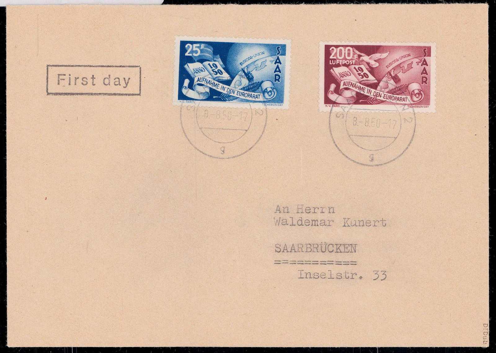 Aufnahme des Saarlandes in den Europarat, beide Marken auf Ersttagsbrief mit Stempel Saarbrücken 2 "g".