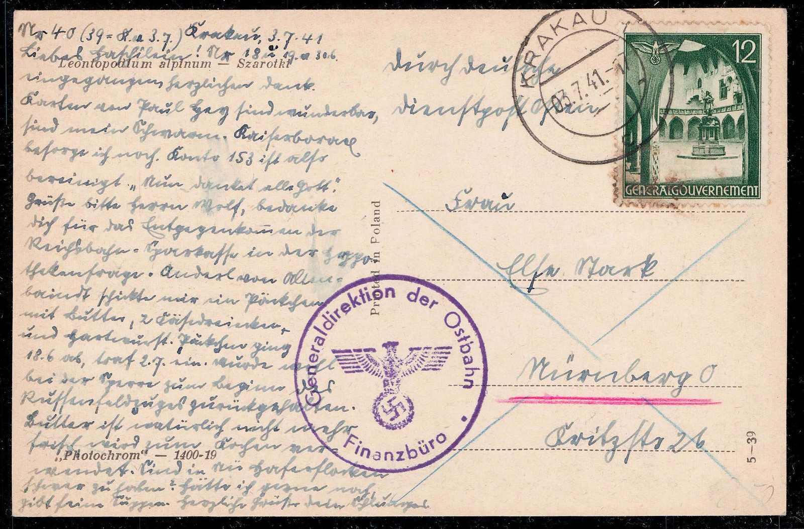 Deutsche Dienstpost Osten. Mit 12 Gr frankierte Postkarte Krakau 3.7.1941 und Briefstempel "Generaldirektion der Ostbahn - Finanzbüro"