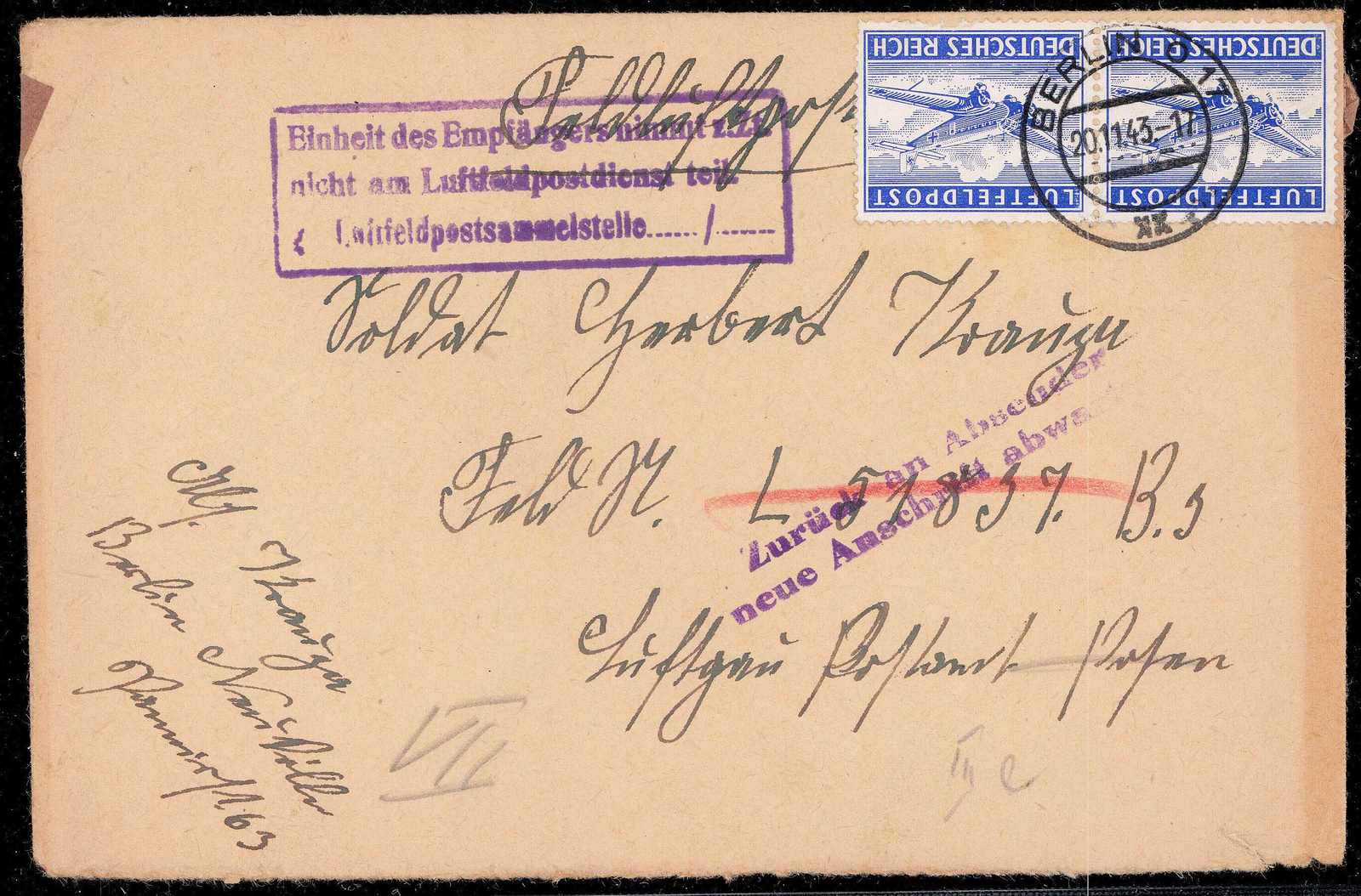 Berlin 20.11.1943 Luftfeldpostbrief an Feldpostnummer L51837. Kastenstempel "Einheit des Empfängers nimmt z.Zt. / nicht am Luftfeldpostdienst teil. / Luftfeldpostsammelstelle .../ ..."