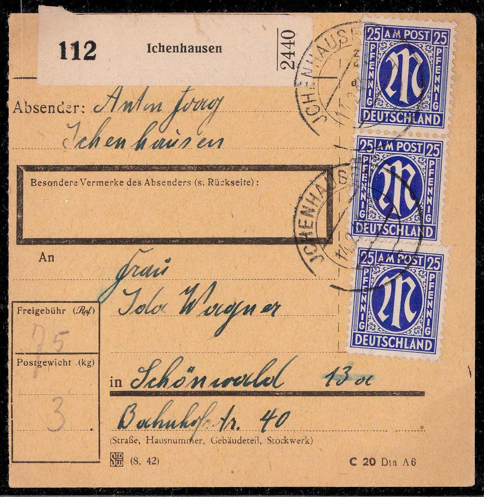 Ichenhausen 14.2.1946, 3 x 25Pf AM POST amerikanischer Druck als Mehrfachfrankatur