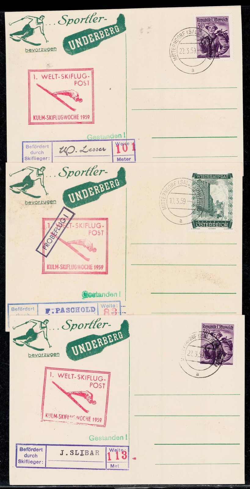 Mitterndorf, März 1959. Skifugwoche Kulm 1959. 3 Underberg Werbepostkarten befördert mit der 1. Welt-Skiflugpost. Stempel jeweils mit dem Skispringer.