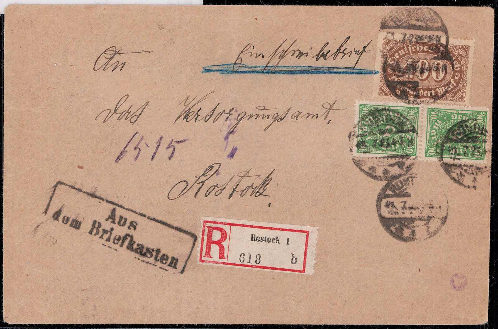 Rostock 21.7.1923, Orts-Einschreibebrief mit schwarzem Kastenstempel "Aus / dem Briefkasten". Kleine Bedarfsmängel. Seltene Verwendung.