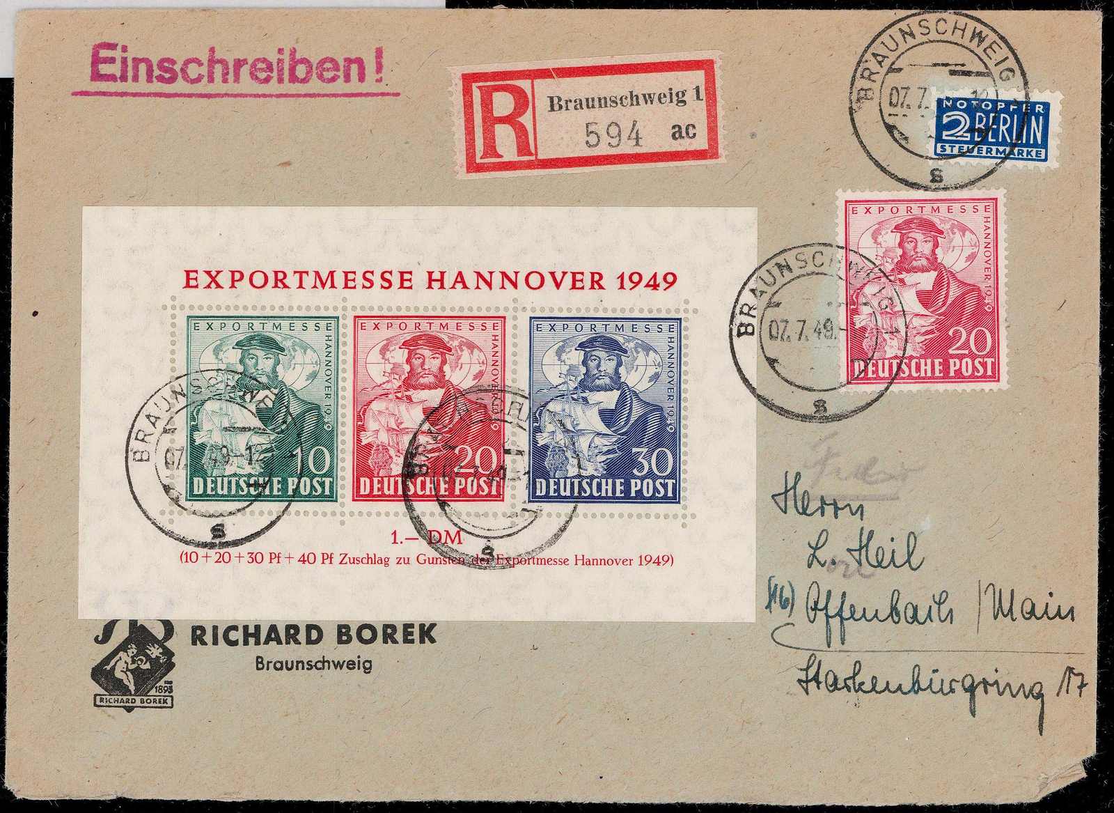 Bizone Exportmesseblock und 20Pf Einzelmarke auf Einschreibebrief Braunschweig 7.7.1949. Umschlag rechts unten leicht beschädigt. Seltene Bedarfsverwenduing.