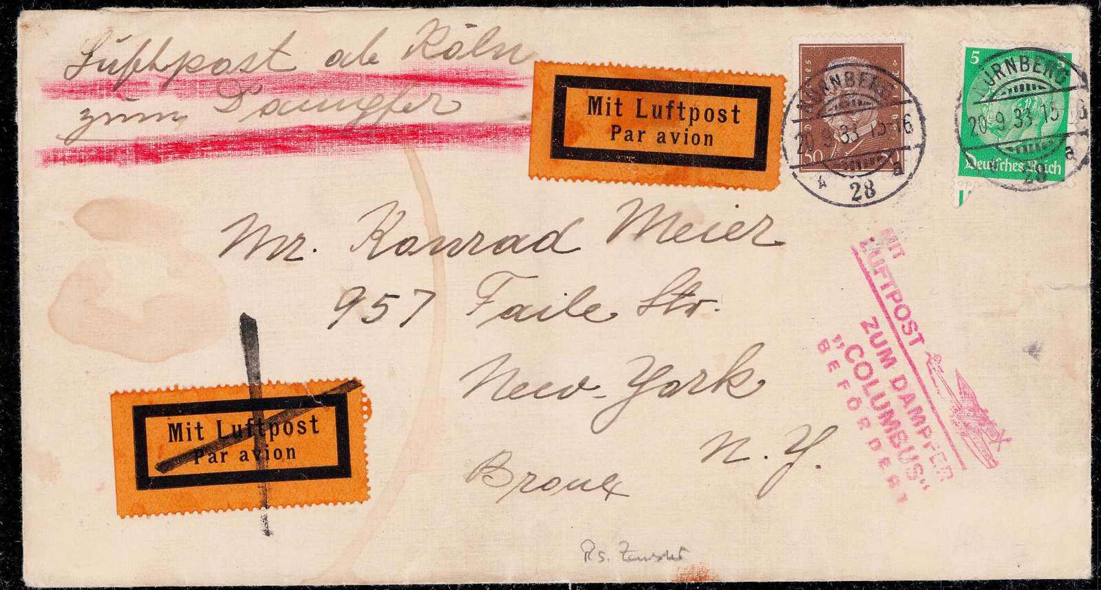 Nürnberg 20.9.1933, Luftzpostbrief in die USA. Ab Köln mit Luftpost zum Dampfer Columbus befördert. Rückseitig zur Devisenüberwachung geöffnet. Seltener Bedarf, daher etwas fleckig und kleine Mängel.