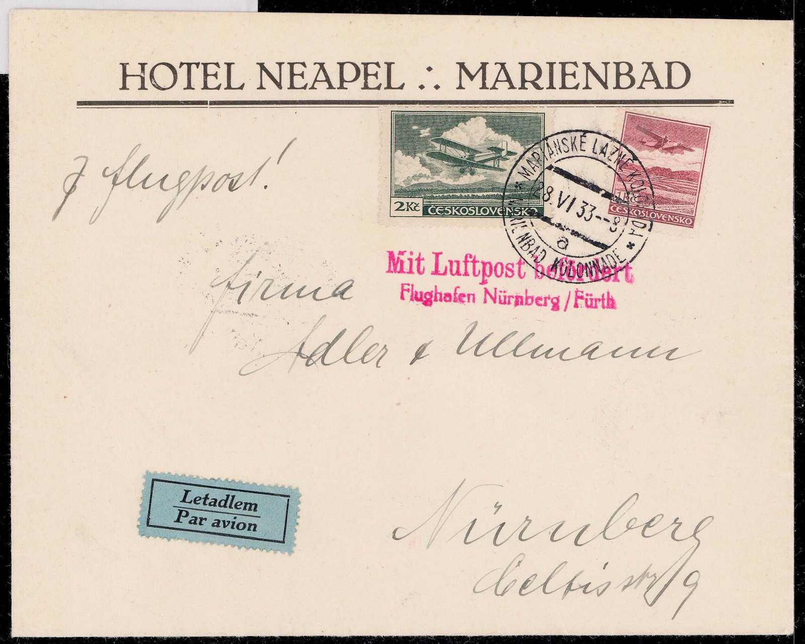 Marienbad 28.6.1933, Luftpostbrief nach Nürnberg mit rotem Zweizeiler "Mit Luftpost befördert / Flughafen Nürnberg/Fürth"