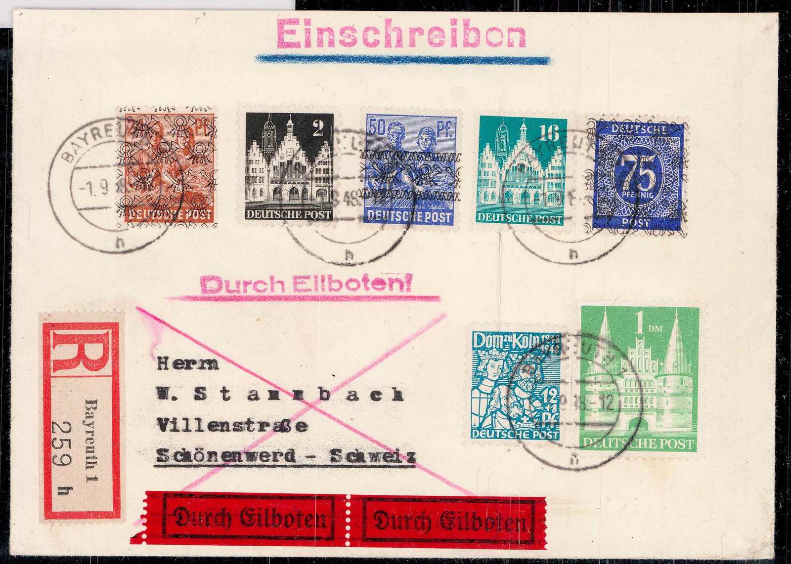 Bayreuth 1.9.1948 Einschreibe-Express Brief in die Schweiz. Mischfrankatur mit Posthornaufdrucke, Dom zu Köln und 3 Werte der Bautenserie. Diese 3 Werte mit Ersttagsstempel!.