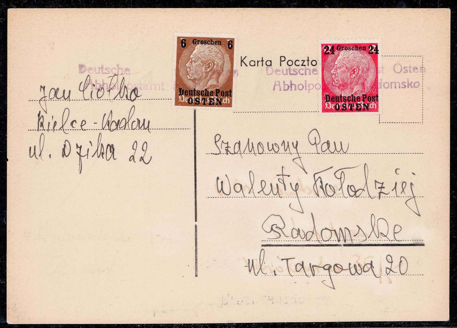 Postkarte mit Stempel "Deutsche Dienstpost Osten / Abholpostamt Radomsko" auf Bedafskarte.