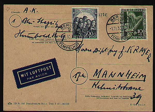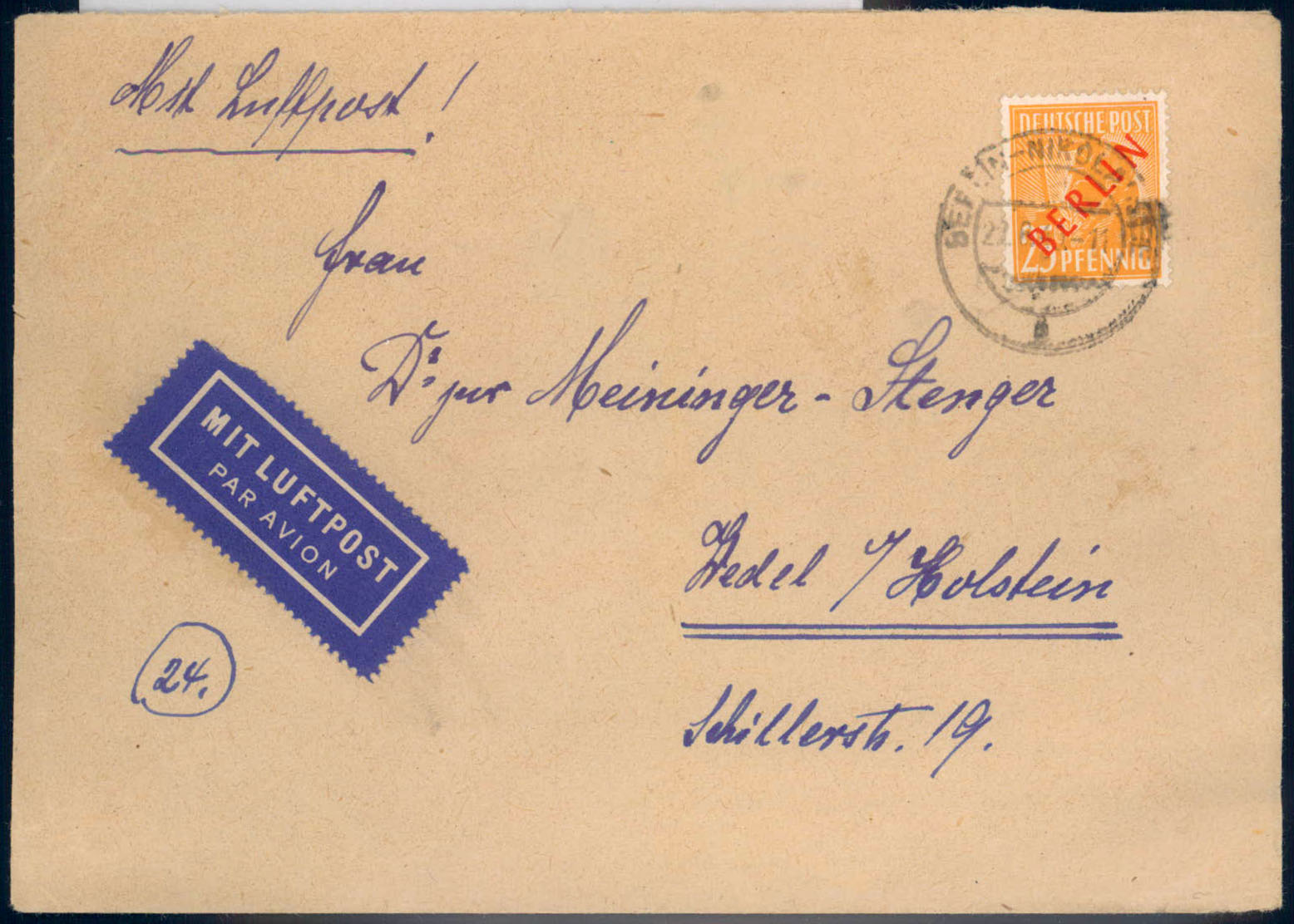 Berlin 22.6.1949. 25Pf Redoverprint on airmail cover to Wedel.