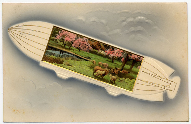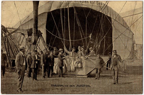 Official postcard "Parseval vor dem Aufstieg" of the Internationale Luftschiffahrt Ausstellung Frankfurt a.M., real used.